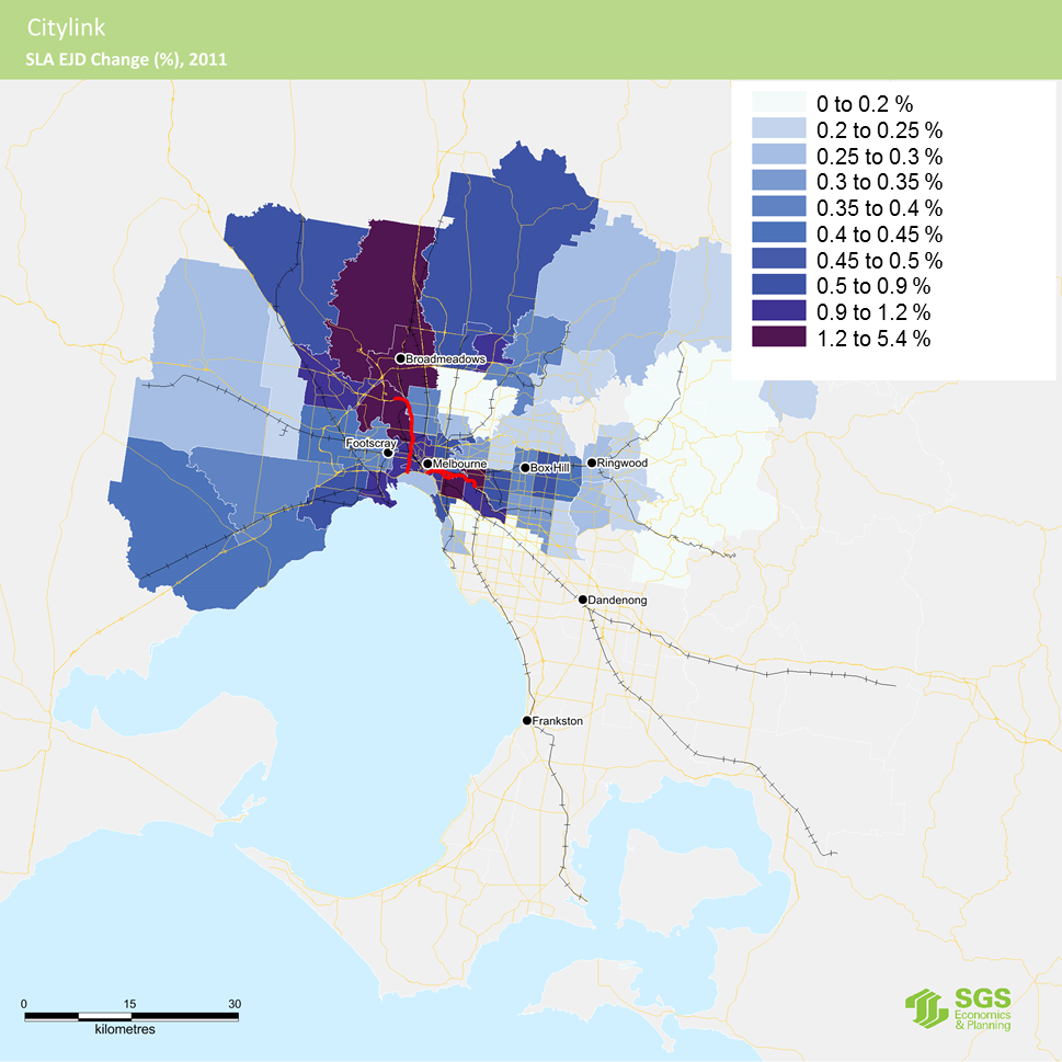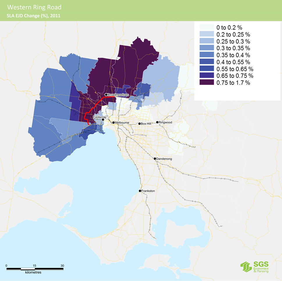 An assumed percentage uplift in relative EJD was applied to the inner, middle and outer rings of Melbourne, based on previous work completed by SGS on major transport infrastructure projects (14% for inner, 7% for middle and 2% for outer rings). These are hypothetical scenarios, devised for analytical purposes only.