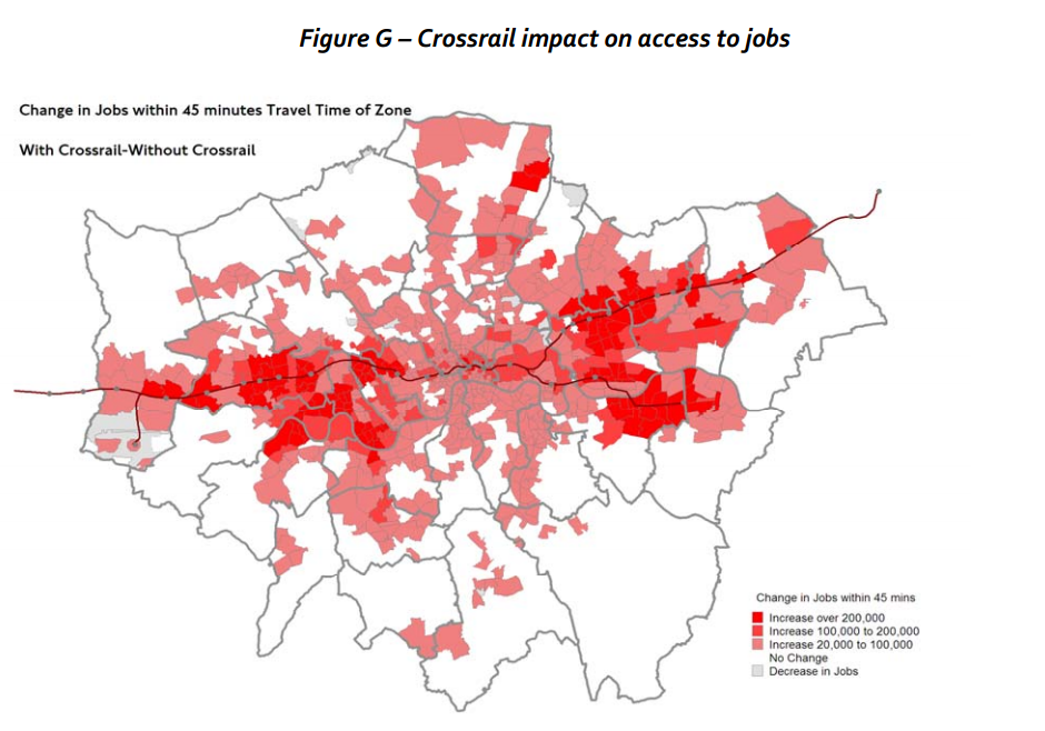 Crossrail is currently under construction in London and will link Heathrow Airport, the West End, the City of London and Canary Wharf through an underground tunnel under central and south east London. The initiative is expected to improve access for 750,000 workers who currently commute into London (Crossrail 2015). Figure 10 highlights the projected impact on accessibility to jobs.