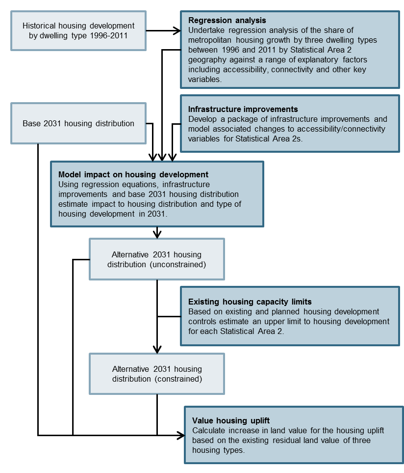 The analysis sought to estimate the extent to which infrastructure investment improves connectivity, as well as the extent to which accessibility influences housing development. The model operated at a metropolitan level given that an increase in supply in one location is likely to impact supply in another.