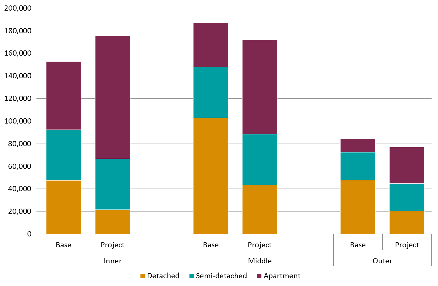 Figure 13 shows the Base Case and Project Case growth in the number of dwellings (by detached, semi-detached and apartments) in 2031 for the inner, middle and outer rings of Melbourne using a Melbourne EJD coefficient. Under these scenarios, the number of apartments across Melbourne would increase, especially in the inner and middle rings. The number of semi-detached houses was not expected to change between the Base and Project Cases, and the number of detached houses fell between the Base and Project Cases, especially in the middle ring, which was projected to contain the greatest proportion of dwellings in 2031.