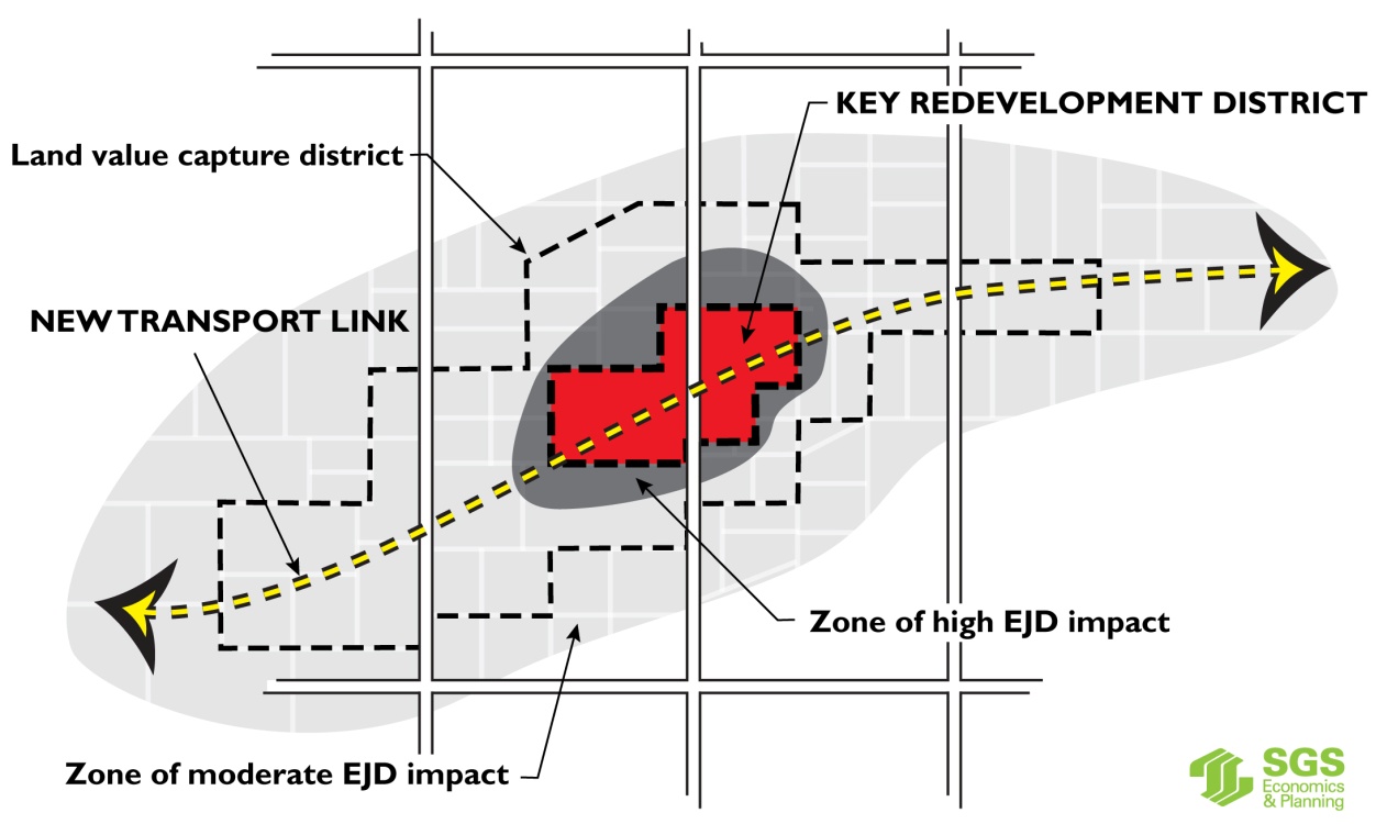 Land value capture districts are the areas that benefit from the transport initiative and could be a candidate for strategies to raise funds for reinvestment in infrastructure by linking to the uplift in land value enjoyed by constituent properties. A range of mechanisms can be used to capture a portion of this land value uplift, including area-wide infrastructure contributions.