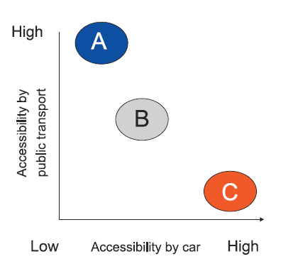 Figure 17 illustrates the concept of establishing criteria for three different locations and highlights the need to understand the suitability of particular land uses for locations with high accessibility by public transport or by car. For example, high density residential uses are suitable for locations with high accessibility by public transport (for example location B) and industrial uses, such as freight, are suitable for locations with road access (for example location C).