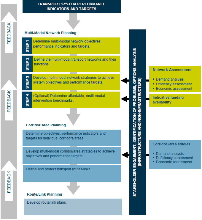 Network planning involves developing a vision of how the transport network should be performing in the future (e.g. anything from 20 to 50 years ahead). The vision must be consistent with the transport system objectives and performance targets and any other government policy choices. The vision should be embodied in a multi-modal network strategy document.