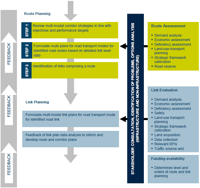 Figure 4 shows the proposed road route and link planning process, complementing Figure 3. It includes elements of best practice principles, as well as the importance of feedback mechanisms that enable the road planning process to not only be top-down (routeâlink), but also bottom-up (feedback loop, so that, link planning informs not only route but also corridor plans and objectives).