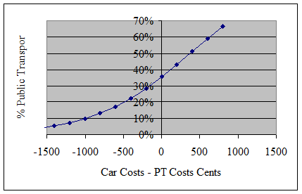 As a further illustration; if the current public transport mode share of motorised travel was 10% (which occurs if public transport costs are $10 more than car costs), then a reduction in public transport costs relative to car of about $5 (500 cents) would be required to raise the public transport mode share to 20%.