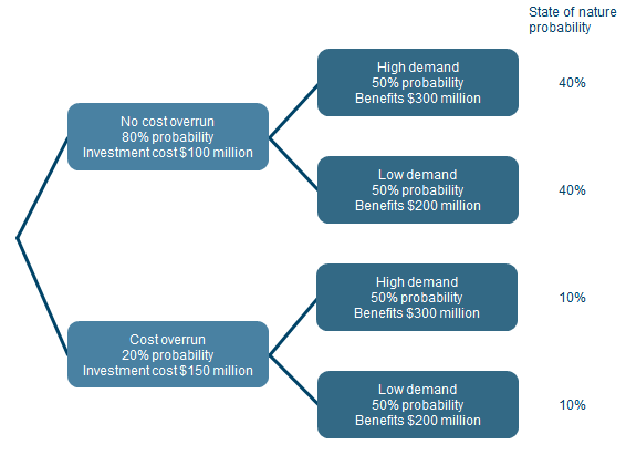 The present value of investment costs for a new initiative is $100 million with an 80 per cent probability, and $150 million with a 20 per cent probability if major cost overruns occur. The present value of benefits is $300 million with high demand and $200 million with low demand with a 50:50 chance of either. The diagram shows the event tree and probabilities for the four states of nature.