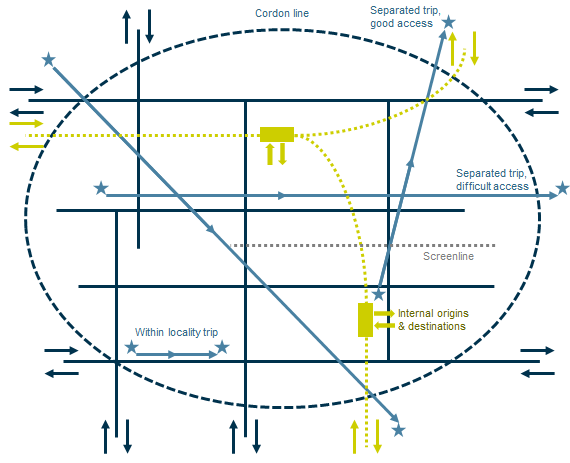 Knowledge of spatial patterns of travel demand is used in transport planning for network and service design. A common method of describing travel demand in a region is through the use of origin-destination matrices. These are tables of trip or commodity movements between the various O-D pairs that exist in a study region (Taylor, Bonsall & Young 2000, pp. 114–116). Consider the schematic map of such a region as shown in Figure 4. The study region is identified by a cordon line around it. Travel movements across the cordon line indicate trips made to and from the region. These are external origins and destinations. Observations on the cordon line can be used to assess the numbers and patterns of these through trips. Internal or local trip movements may also exist for trips where either or both the origin and destination of the trip are located inside the study area. Further information on through trips (such as routes chosen for the segments of those trips inside the study area) and local trips can be gathered by defining screenlines inside the study area and then making observations of vehicle movements at the screenlines. Traffic management studies are often concerned with the proportion of through traffic to local traffic in the study area.