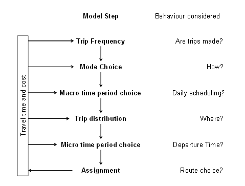 The four step model is a framework that represents the scope of functions that are typically represented in transport models. The emphasis given and complexity of individual steps, and interactions between the steps is part of the model design task. In contexts where there are substantial changes in accessibility envisaged, or the modelling has been focused on a particular corridor, it may also be important also to model changes in trip frequency (whether trips as defined within the model scope are made or not) and possibly changes in land use and thus expanding and more fully integrating the trip generation step. In other cases there may be a need to represent changes in when trips are made, in which case a fifth ‘step’ may need to be incorporated to this standard framework.